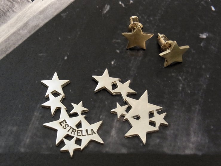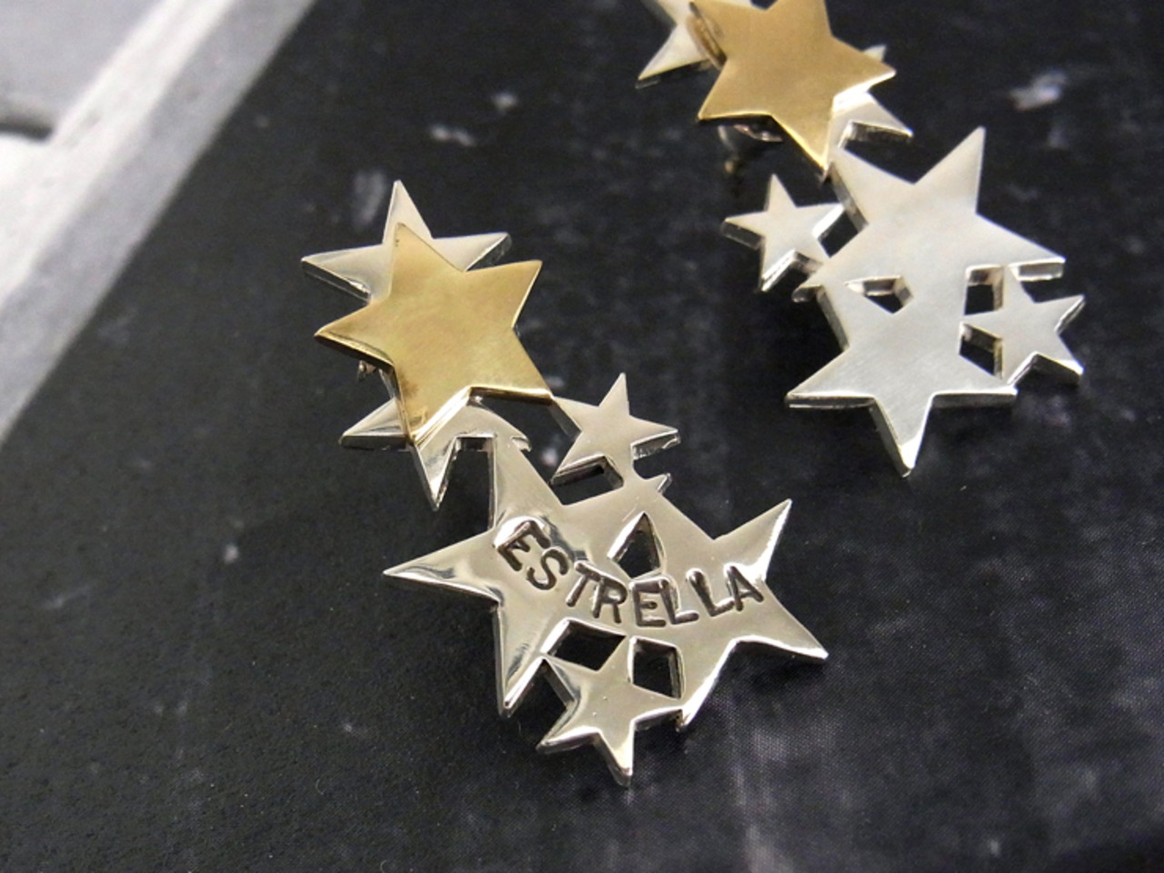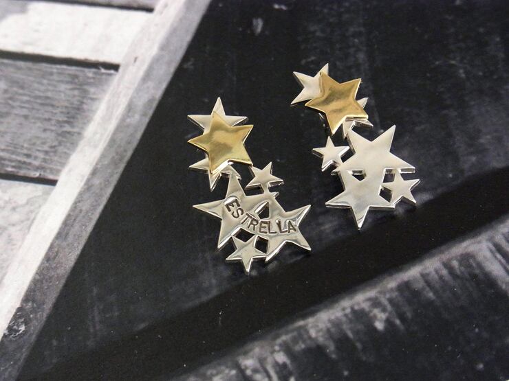 右耳の方にのみスペイン語で星を意味するestrellaという刻印がはいったアシンメトリーなデザインとなっております。
