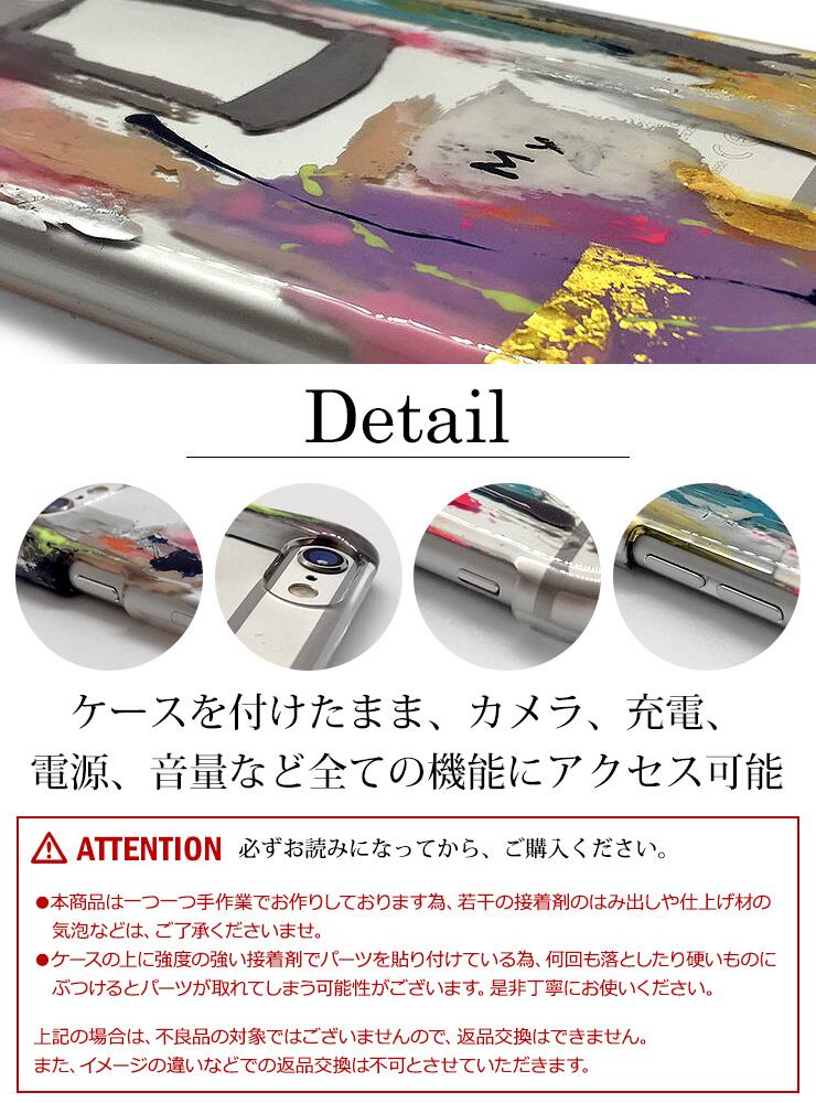 ・ケースの上に強度の強い接着剤でパーツを貼り付けている為、何回も落としたり硬いものにぶつけるとパーツが取れてしまう可能性がございます。是非丁寧にお使いください。