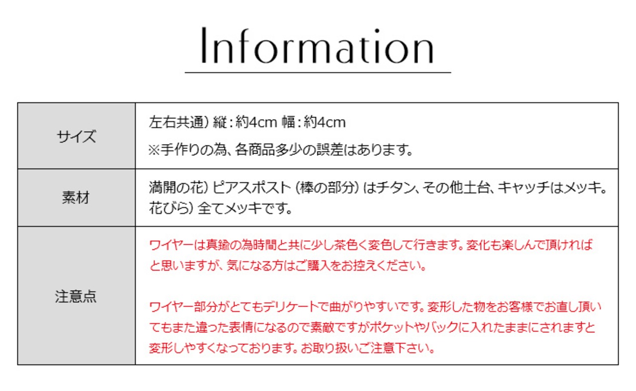 ワイヤー部分がとてもデリケートで曲がりやすいです。変形した物をお客様でお直し頂いてもまた違った表情になるので素敵ですがポケットやバックに入れたままにされますと変形しやすくなっております。お取り扱いご注意下さい。