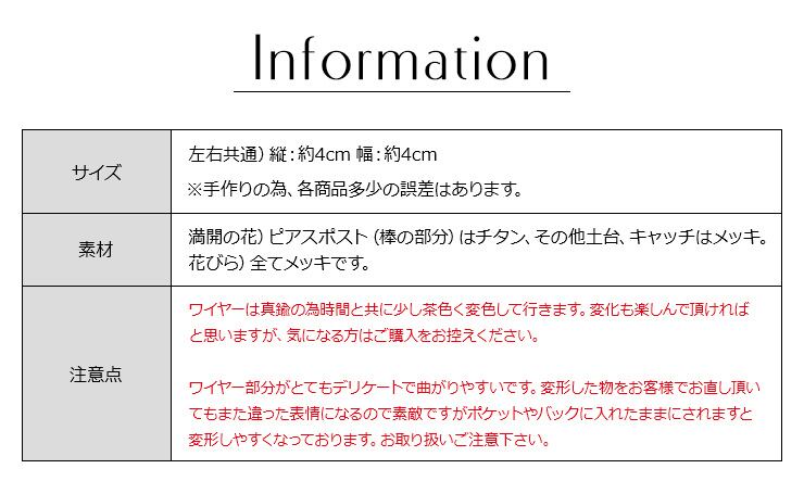 満開の花:ピアスポスト(棒の部分)はチタンですが、その他土台、キャッチはメッキです。